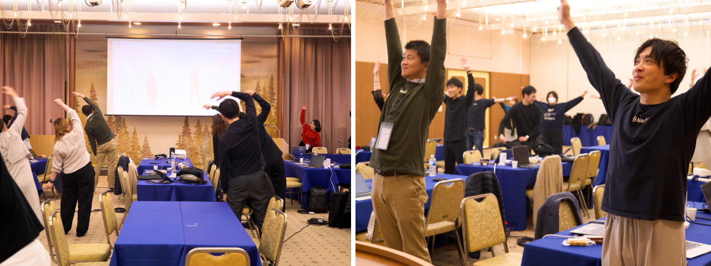 2日目の朝はラジオ体操から。前回、2日目の休憩中にやってみたらとても評判が良かったので、定番プログラムとして取り入れられました!