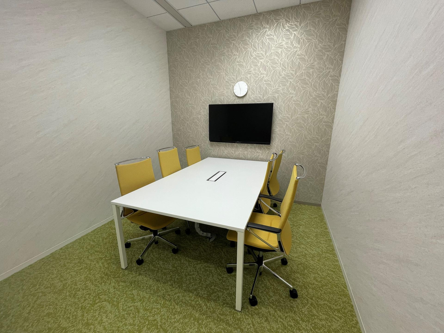 ビタミンカラーの椅子がアクセントになっている6人用会議室、