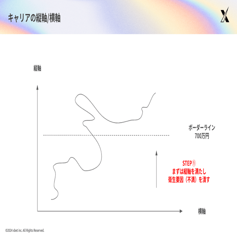縦軸、つまり年収やポジションにはキリがありません。上を見れば無限に存在します。そこで大切なのが、「これだけはクリアしたい」というボーダーラインを決めることです。