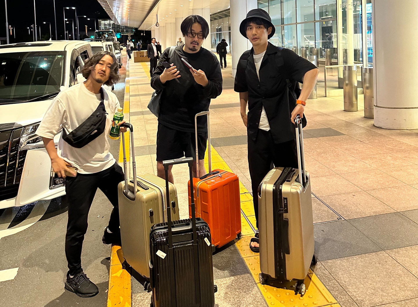 (左から営業推進の石田、エージェントの西田、デザイナーの寺島。空港に着いた途端すでに旅行気分。)