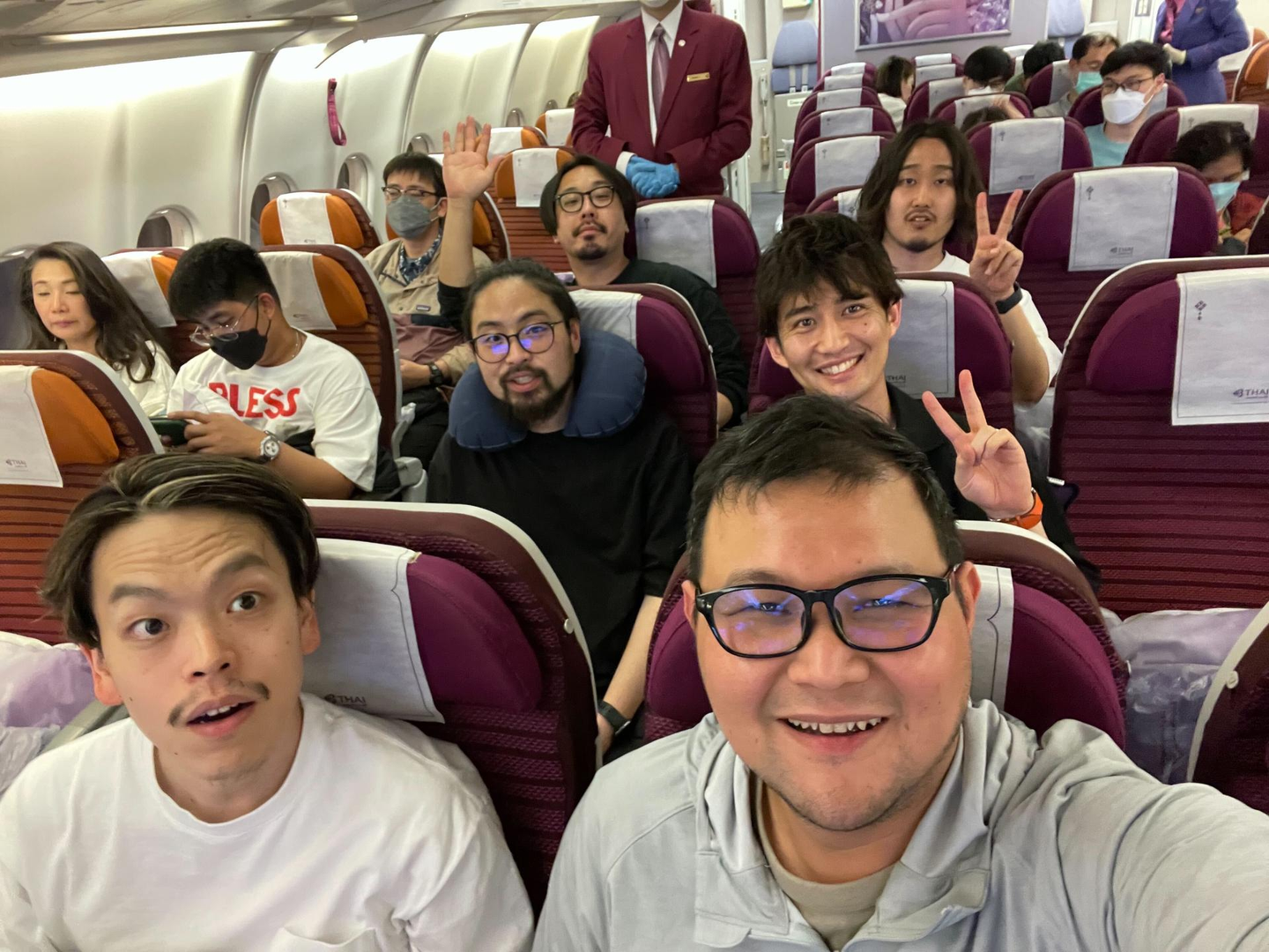 無事にゲートをくぐり、飛行機の中でパシャリ。社内ではじめてのタイ出張ということもあり、全員がワクワクと期待感を抱いていました。この時出発は深夜のため全員仕事終わりでしたので、到着まで寝てました。