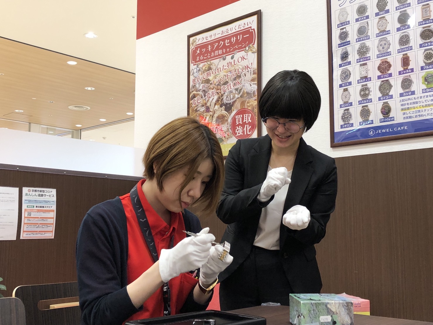 ジュエルカフェの名の通り、カフェでくつろいでいるかのような空間を。居心地の良さを追求した店作りと、女性従業員による丁寧な接客、会員様向けの豊富なアフターサービスで、沢山のお客様からのリピート来店をいただいています。高い接客の質を保つため、定期的にミステリーショッパーを利用し、そのフィードバックをサービスの継続した改善に役立てています。もちろん、商品知識に関わるスタッフ研修も欠かしません。