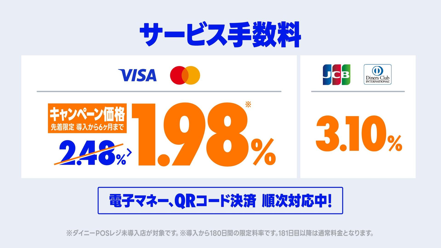 株式会社ダイニー(本社:東京都港区/ 代表取締役:山田真央/以下、ダイ二ー)は、飲食店に特化した決済サービス「ダイニーキャッシュレス」(※1)の提供を開始するにあたり、2024年9月19日から飲食店向けに申し込み受付を開始したことをお知らせします。また、提供開始を記念して、「ダイニーPOS」未導入店を対象に先着2,000店舗限定で、決済手数料率1.98%で「ダイニーキャッシュレス」を提供する「ダイニーキャッシュレス手数料割引キャンペーン」(※2)を実施します。