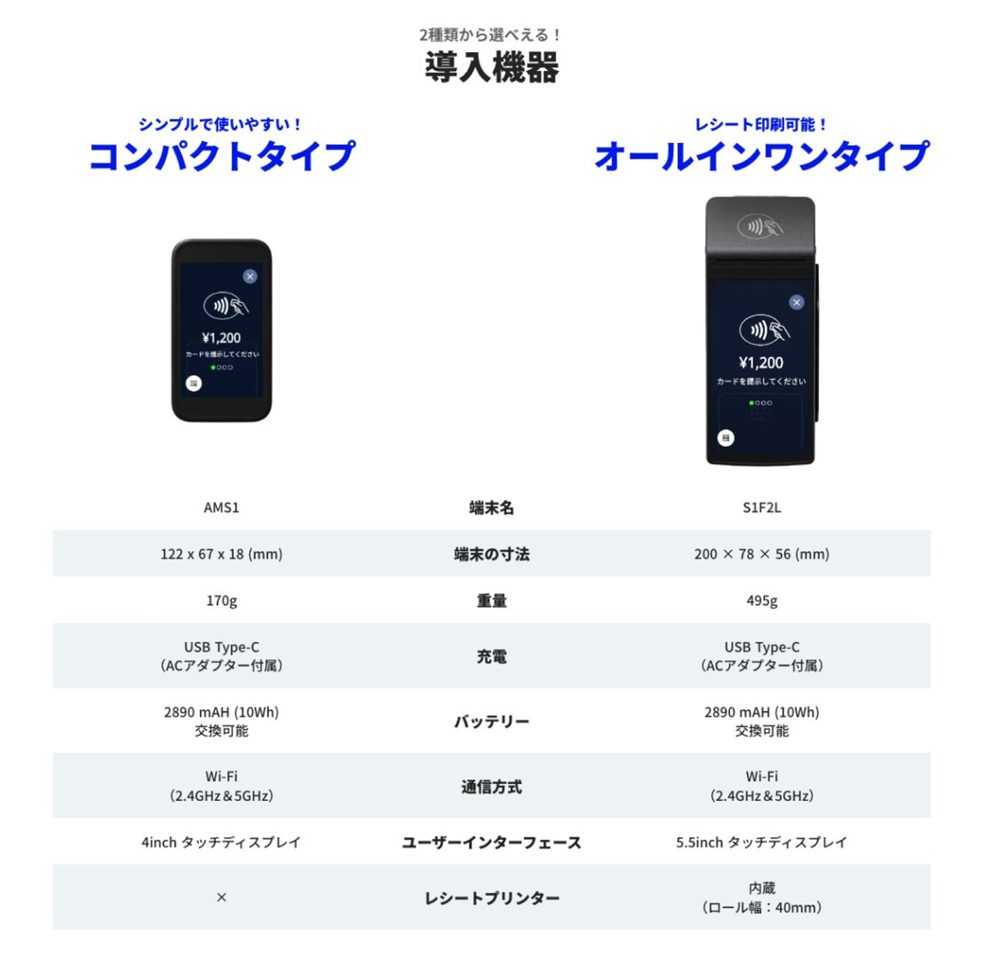 決済端末は、シンプルでスッキリしたデザインになっており、2種類(レシート印刷の有無)からお選びいただけます。
