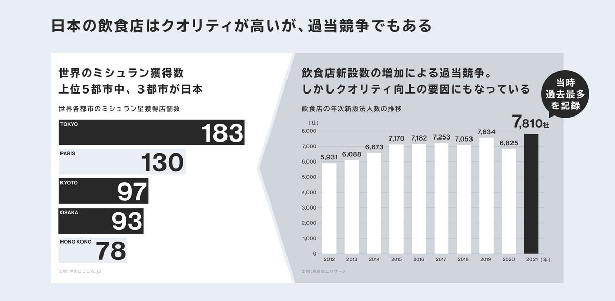 こちらの数字だけを見るとイメージが湧きづらいかもしれませんが、自動車、医療、建設などに並ぶ市場規模であり、国家の屋台骨になっているといっても過言ではありません。日常生活を振り返ってみても、日々友人と楽しい時間を過ごしたり、恋人とドキドキする空間を過ごしたり、時にはハラハラする業務上の交渉を行ったりと、飲食店は常に私たちの生活の一部にあります。また星付きレストランのランキング上位5都市のうち3都市が日本であることや、観光客が日本を訪れる理由の大半は日本食が目的であるなど、世界からの日本“食”の評価は大変高く、日本の経済を大きく動かしてくれるコンテンツです。