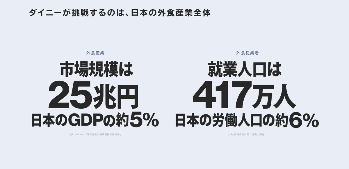 ダイニーが挑戦している外食産業は実はかなり大きく、市場規模は25兆円、日本のGDPの5%を占めています。