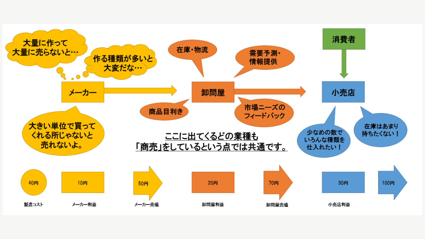 僕たちが普段生活をする中で「卸売業」と接する機会は多くないため、イメージが湧かない方もいらっしゃると思います。今回はできる限り分かりやすく説明を試みたいと思います。