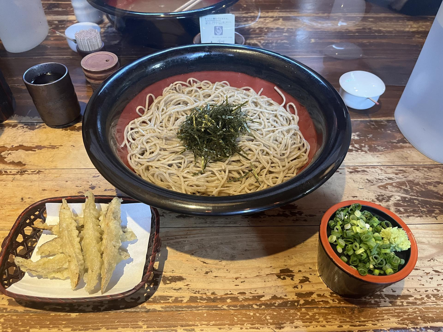 今回注文したのはざるそばとごぼ天!(九州ではごぼう天の事をごぼ天と呼びます)なんと、ランチタイムは3玉まで同じ料金、ランチタイム以外は何玉食べても同じ料金です(笑)もちろん3玉頼みました。
