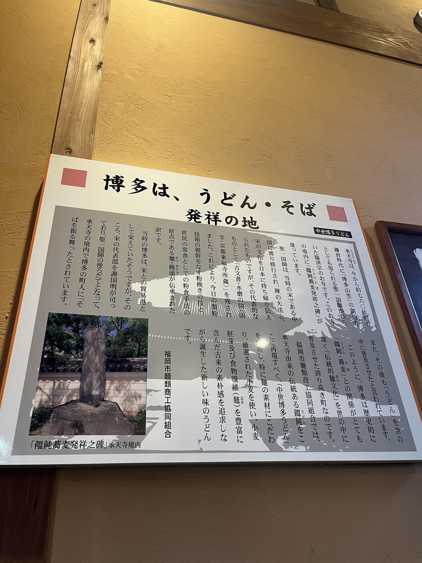 実は博多こそうどん・そば発祥の地と信じられていて、店舗の隣にある承天寺には饂飩(うどん) ・ 蕎麦 ・ 饅頭発祥の碑があります☺