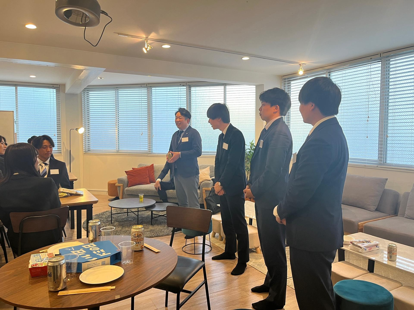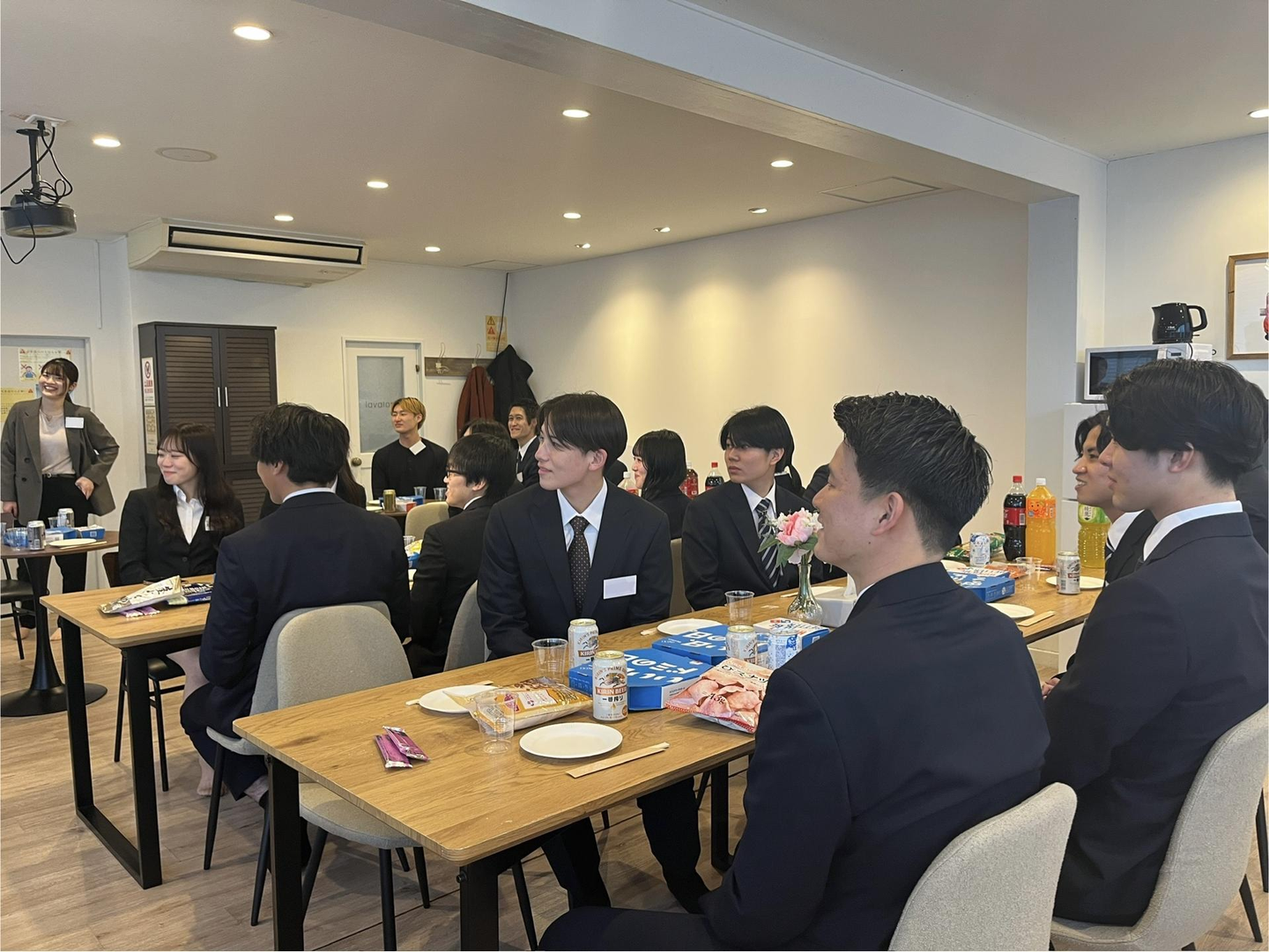 その後は場所を移動して現場社員との交流会を開催✨入社目前ということで、年齢の近い社員とお話していただきました!