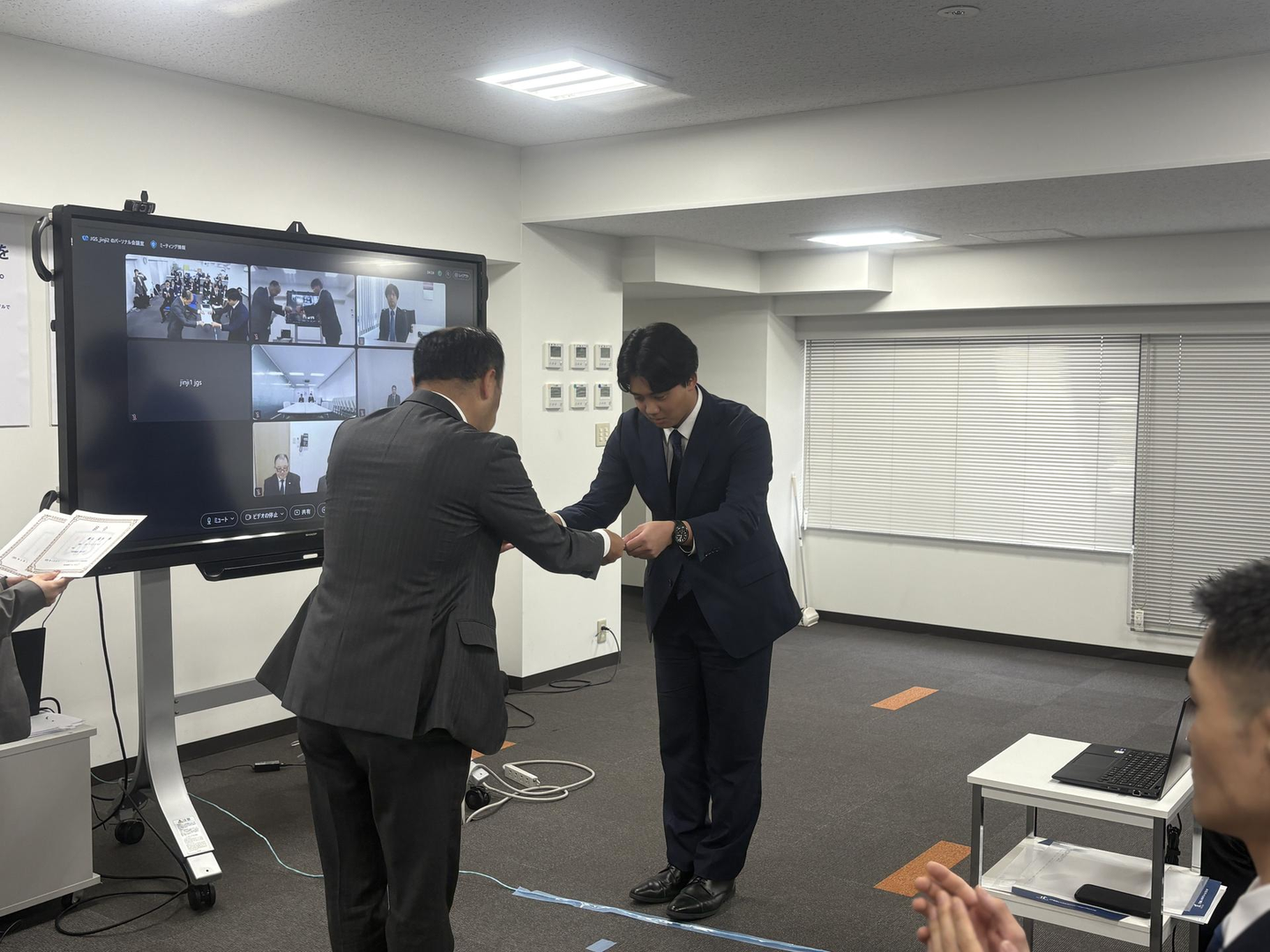拠点長もWEBで見守るなか、ひとりずつ辞令・修了証をお渡ししました。