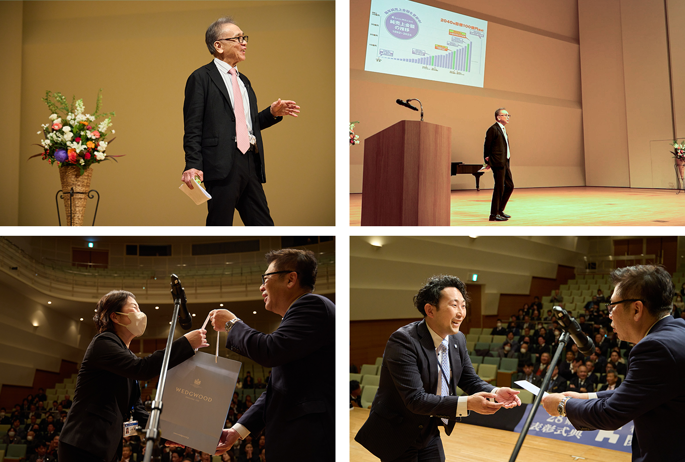 社長からのお話に始まり、会社全体の業績やコウノトリの取り組み等を振り返り、来期に向けての目標を全員で確認して各部門ごとの表彰に移りました。