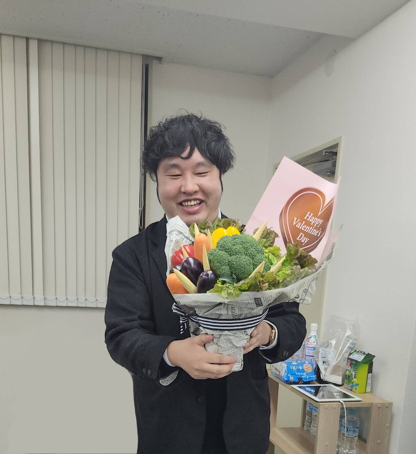 普通に渡すんじゃ面白くないな~と冷蔵庫に詰められたベジブーケ。「部長が営業から帰ってきたら冷蔵庫開けるように仕向けて渡しましょうか!」「でも大体帰ってきたら水飲むのに冷蔵庫開けない?」「じゃあいつまで経っても開けなさそうなら誘導しましょうか」とふわっとした作戦を立てた私たち。