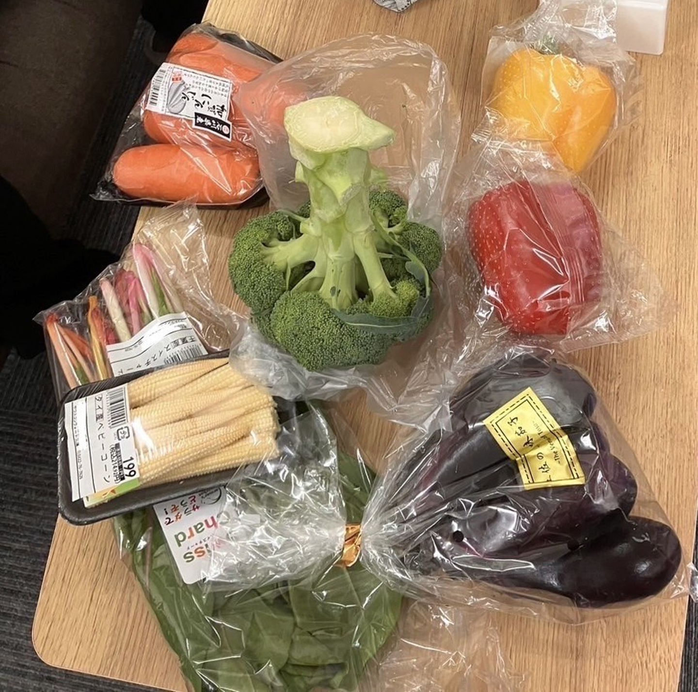 可愛い!これなら部長も食べられるぞやったね!!という事で制作を開始。作り方も様々なサイトに載っているので、カラフルな野菜とラッピング用品で素敵なベジブーケができました!