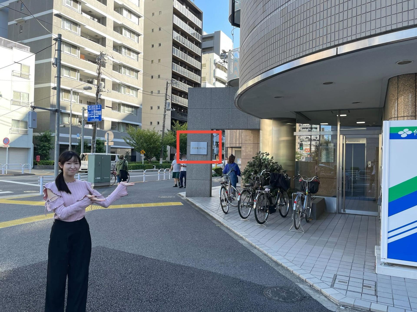 ⑦右に曲がった後まっすぐ進むと、角に「大森勧業ビル」が見えます。