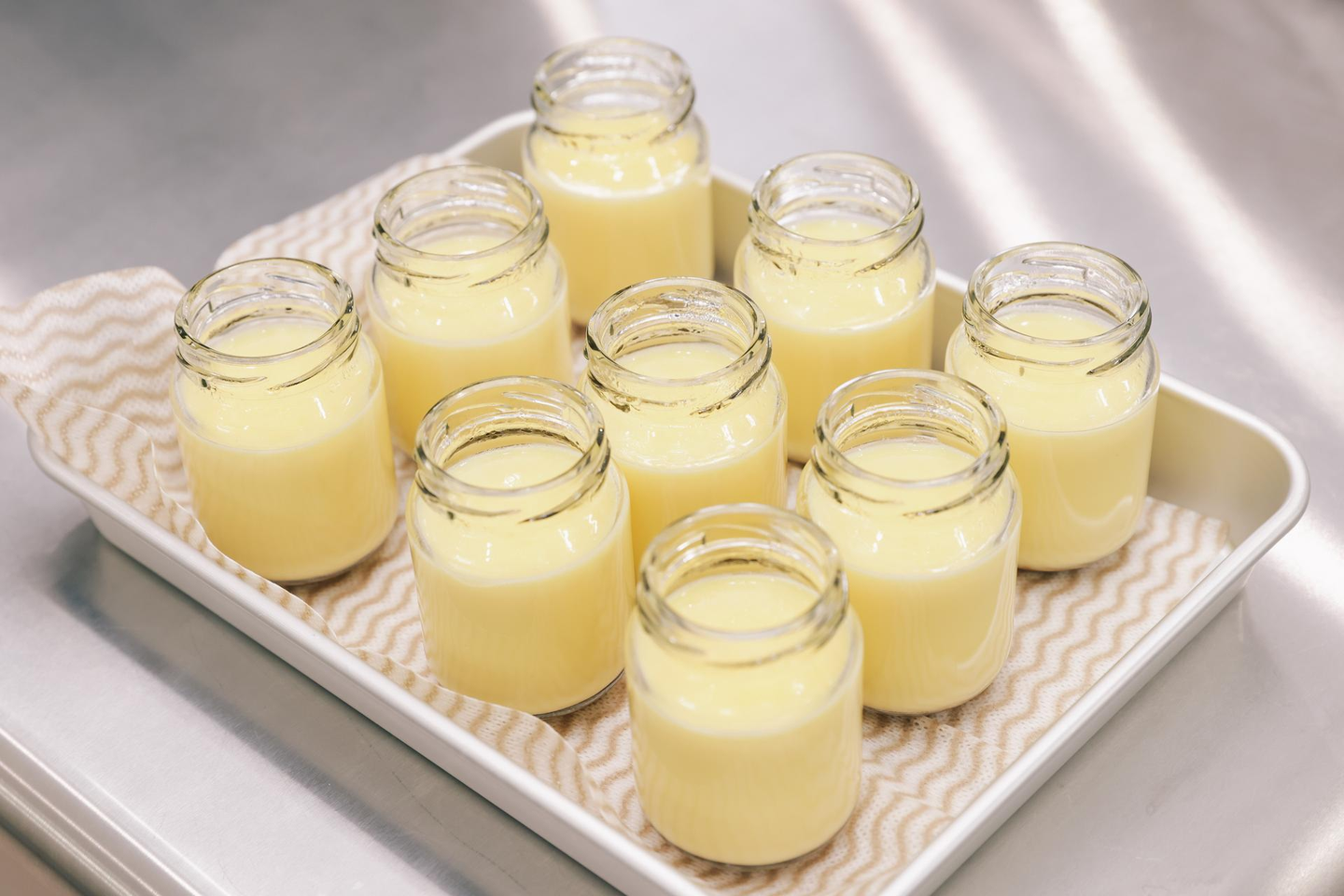 オープン前後の1か月は試行錯誤の毎日でした。プリンの原材料は卵・牛乳・砂糖がメインのとてもシンプルなおやつのため、作り方をひとつひとつ丁寧にしないと、味や見た目にすぐ影響が出てしまいます。障がい者の方とゆっくり時間をかけられる工程と、スタッフだけで熱湯を扱いながらスピーディに作業する工程があり、工程表通りに毎日取り組めばプリンがきれいにプリンができるとは限らないんです。それをご利用者様(通所する障がい者の方々)とスタッフと役割分担して、美味しいなめらかプリンができるように何度も何度も試行錯誤を繰り返し。気付けば試作したプリンは200個を超えていました。