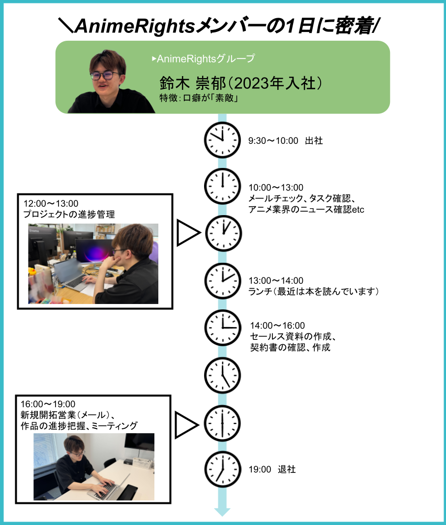 鈴木:鈴木です。2023年12月に入社しました。今は自社アニメ作品の海外セールスをメインに活動してますが、アニメ作品のプロデューサーやアシスタントプロデューサーも行っています。