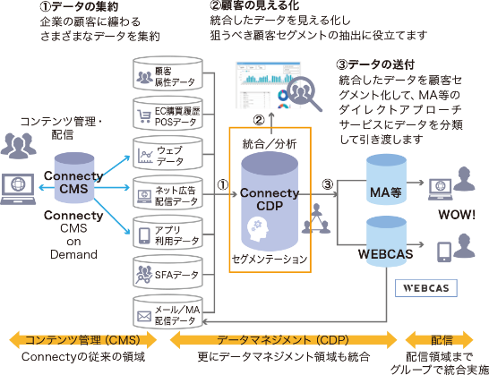 「Connecty CDP」は、顧客情報・営業履歴・アンケート結果といったデータをクラウド上で統合管理するための機能です。Connecty CMS on Demand で管理しているWebサイトのデータとあわせて、統一感のあるコンテンツマネジメントを実現します。