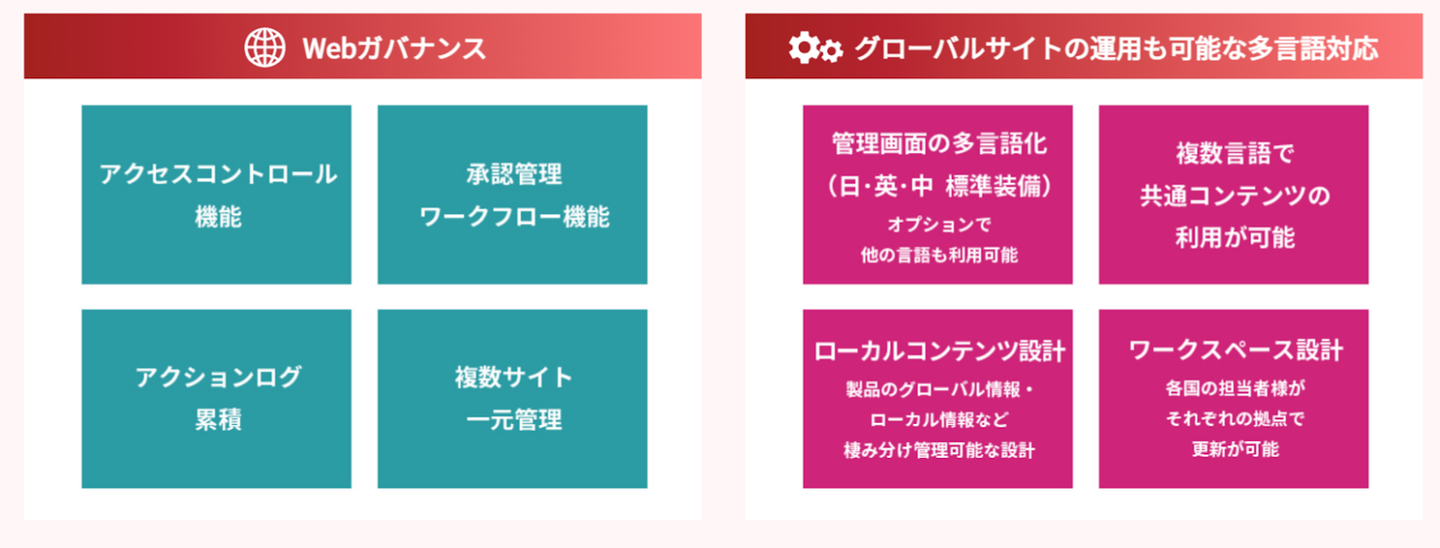 例えば異なる作業者による更新を管理する機能や、多言語に対応した管理画面。その他にもクラウドならではのメリットとして、複数のWebサイトを一元管理できることなども挙げられます。グローバルにWebサイトを展開し絶え間なく更新を行うといった、大企業のサイト運用に必要な機能を完備しています。