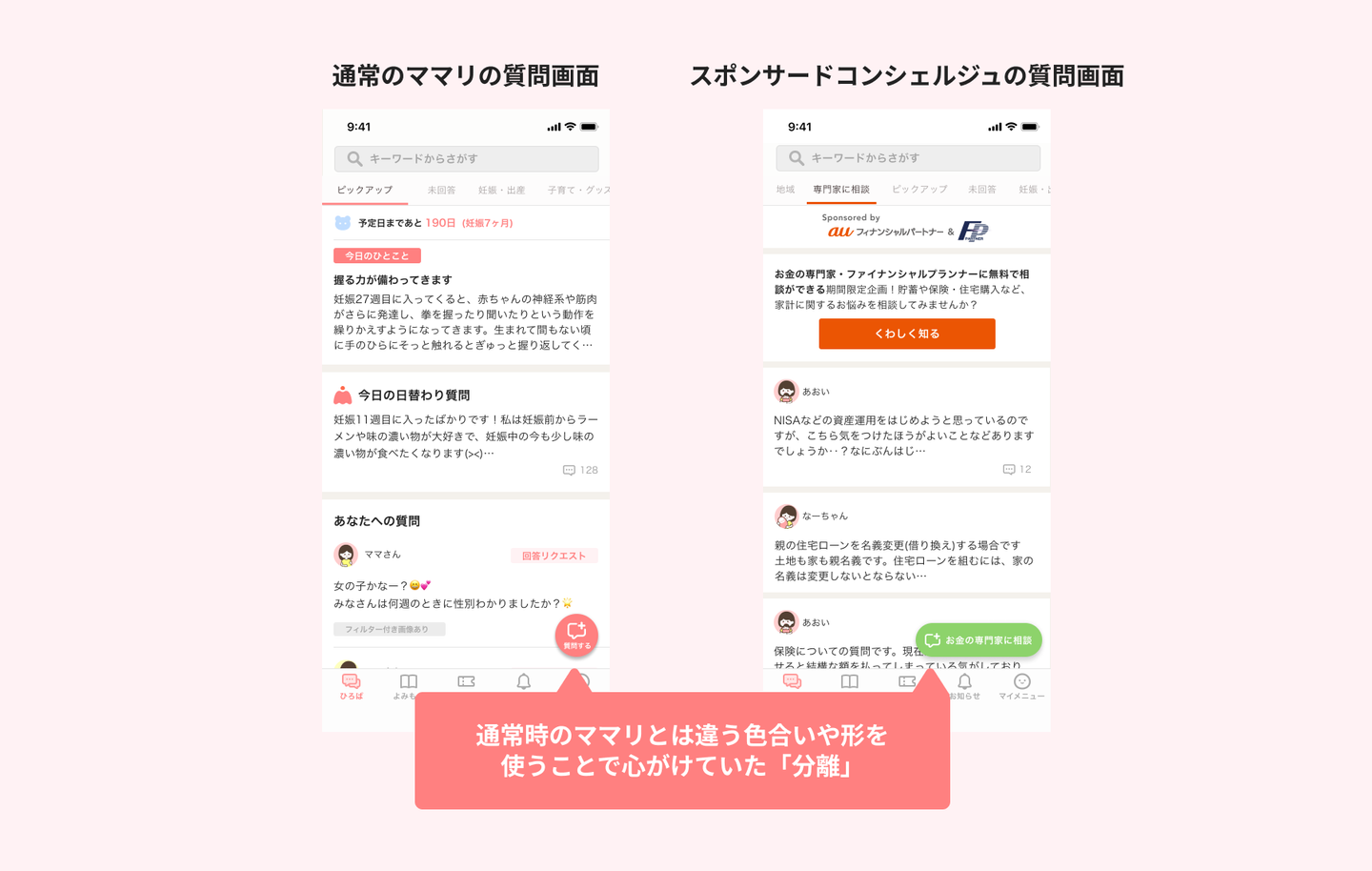 鍋野:星野さんからもお話があったように「スポンサードコンシェルジュ」は、ママリのこれまでの体験と全然違うものになるため分離をするように心がけましたね。いつものカテゴリーへ投稿するのと、専門家への質問は得られる体験や回答が全然違うものなので他のカテゴリーとは違う色合いを使い、ユーザーの混乱を招かないように工夫しました。