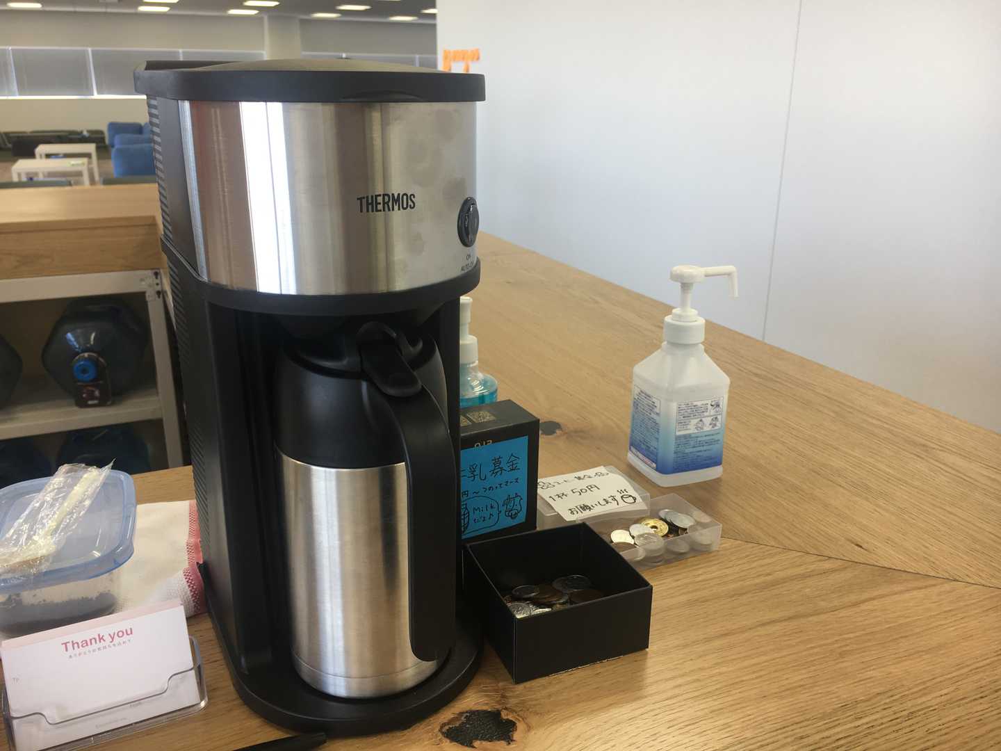 社員が自主的に始めたシステムで、1杯50円をINして自分でつくるシステムです。