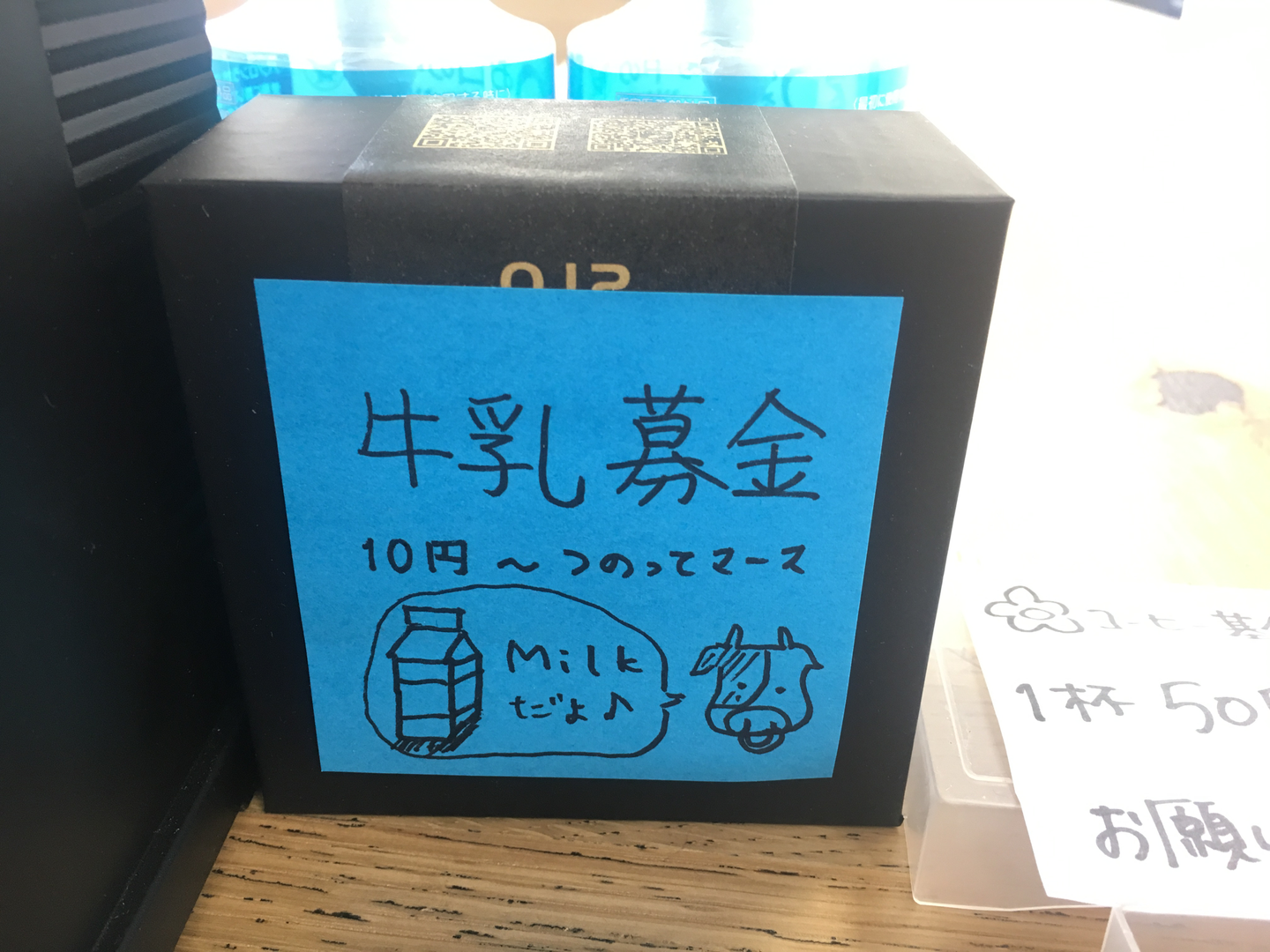 となりにはCTO発案の「牛乳募金」も!カフェオレにして飲めるのが嬉しいですね。