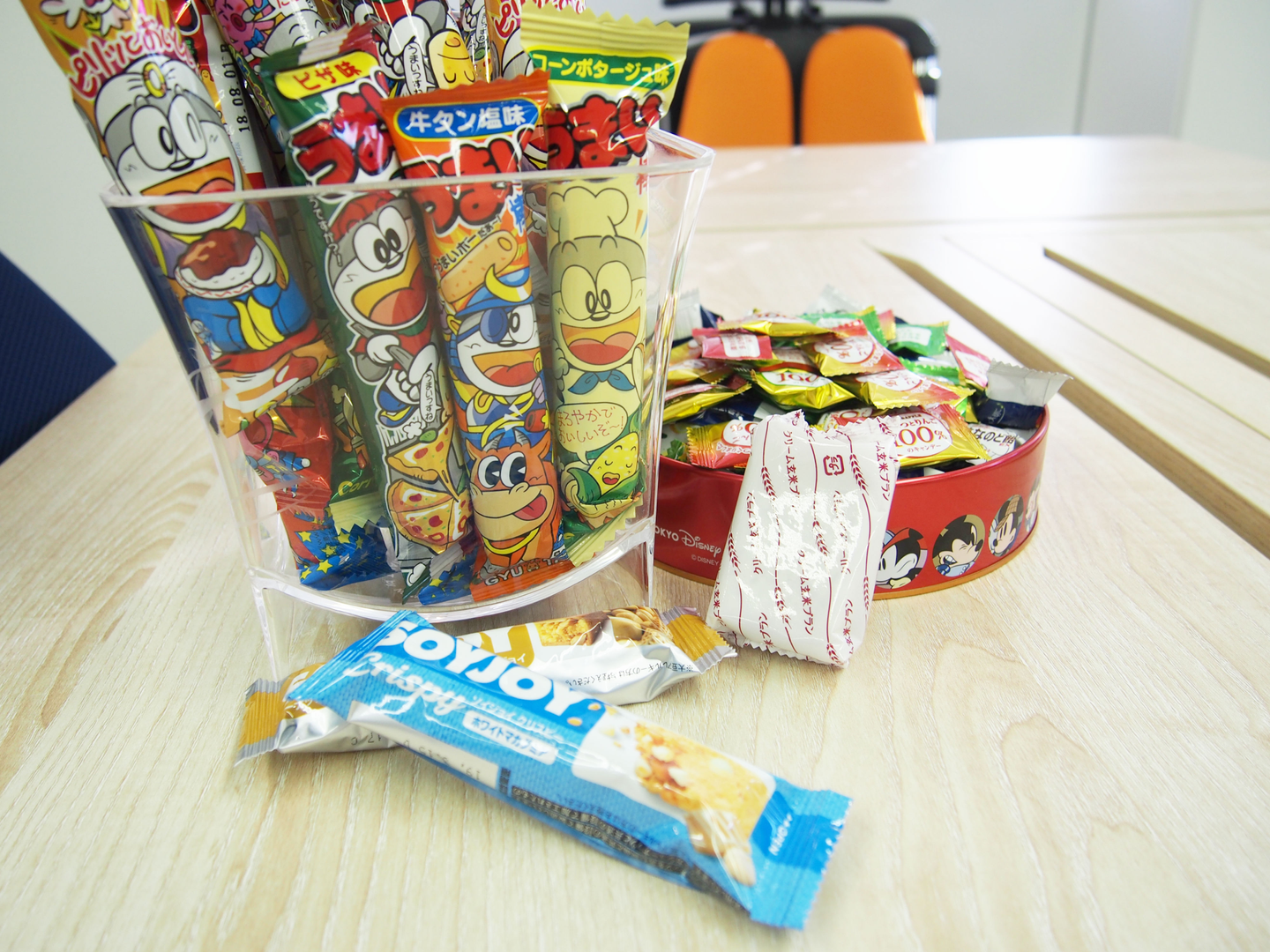 会社には常に、お水・お茶(2種類)と軽食のソイジョイやブラックサンダー、飴などが置いてあり、いつでもだれでも飲み放題、食べ放題です。