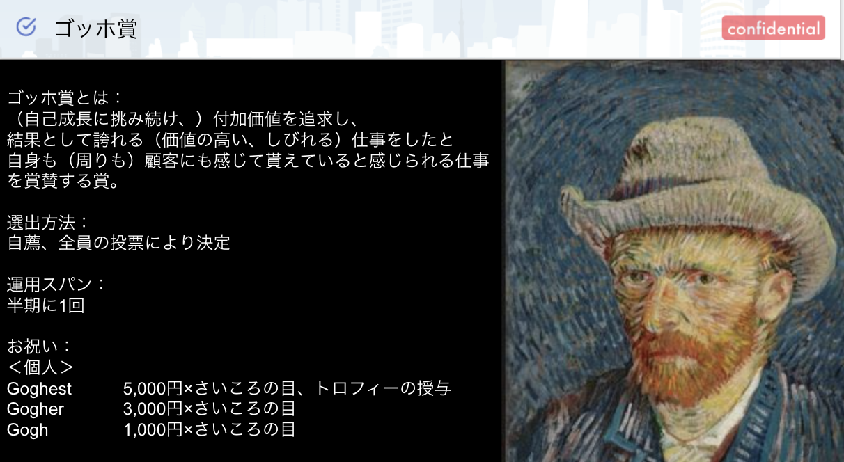 経営、各事業部からの発表の後は、表彰タイムです! 毎年恒例の、ゴッホ賞を選出する時間がやってまいりました。