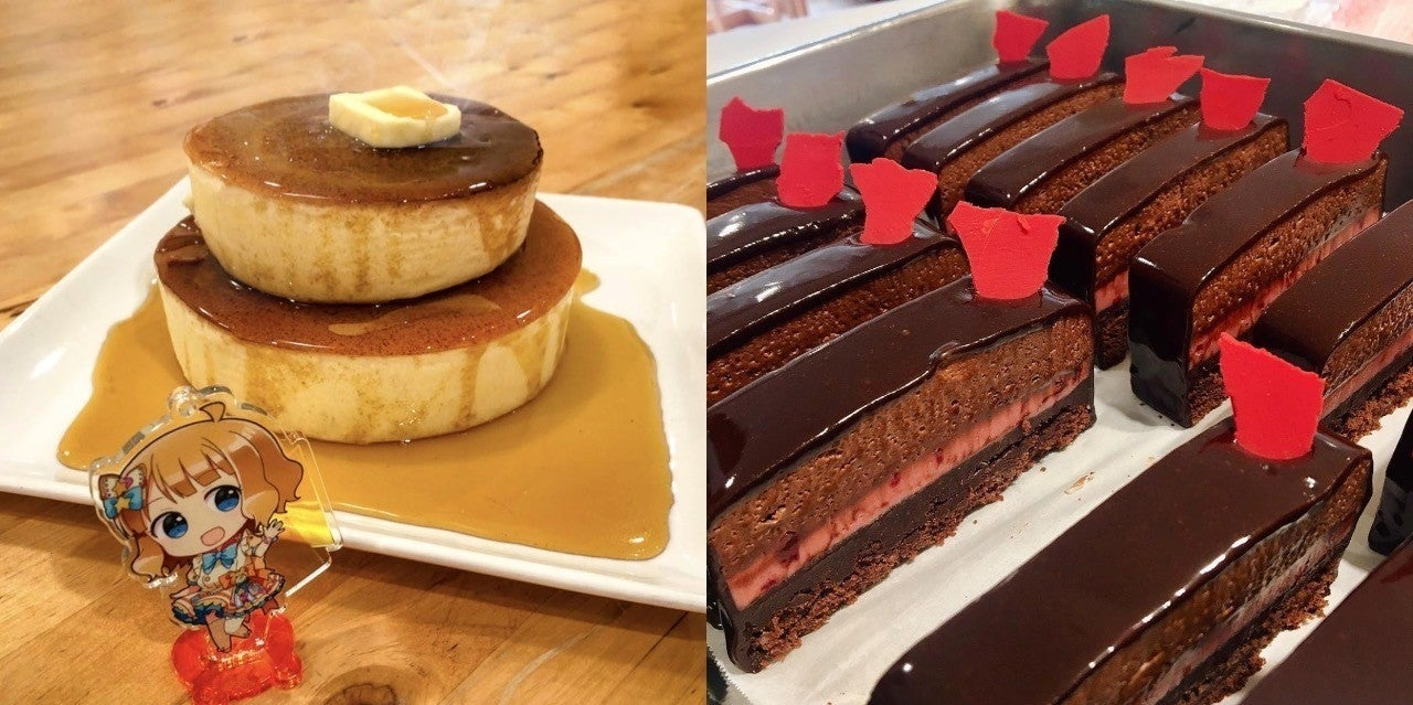 (左からホットケーキ、ダークチョコレートとフランボワーズのケーキ)