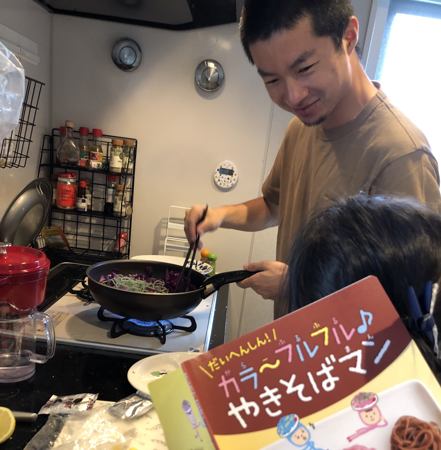 [写真:クックパッドの別事業おりょうりえほんとのコラボ商品、カラフル焼きそばを娘と作った様子]