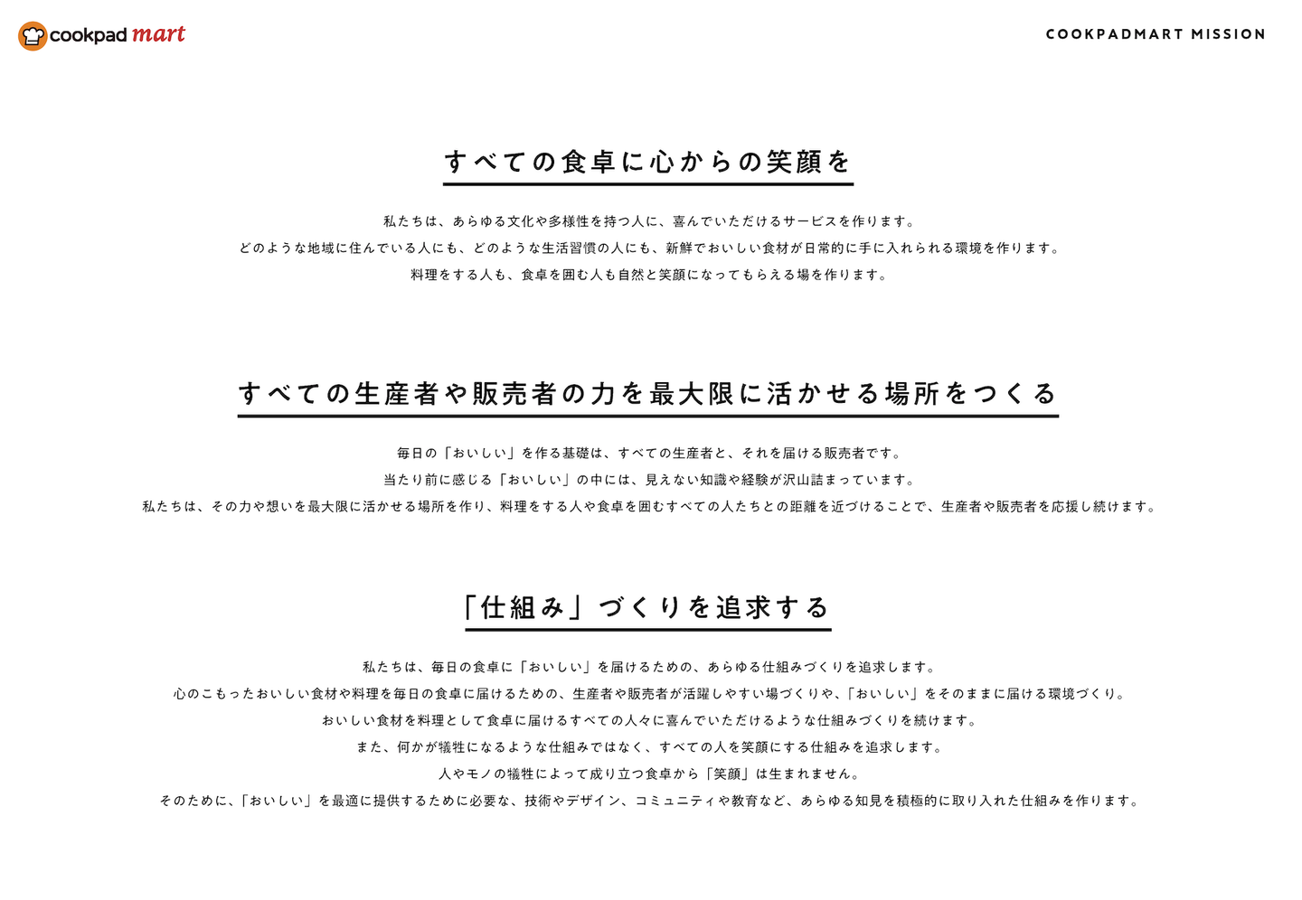 分散型流通モデルで地域の生産者や専門店と消費者を繋ぐことができれば、鮮度の良い商品をよりお手軽に買えるという直売所や道の駅のような購入の選択肢を大規模なスケールで実現することが可能になります。既存食品流通を完全に代替していくのでなく、 新しい生鮮食品の買い方の1つとしての社会への提案 、それがクックパッドマートの挑戦であり、立ち上げから3年経ちその世界が少しずつ実現されていくことにワクワクしています。