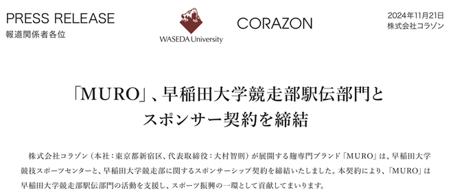 https://prtimes.jp/main/html/rd/p/000000021.000022992.html (続きはこちらから) 本日のプレスリリースにて、CORAZON社の一つの事業であるMUROが、早稲田大学競走部駅伝部門のスポンサーとなるニュースを発表させていただきました。リカバリー、コンディショニングを、KOJI DRINK (米麹甘酒ベース)、KOJI FOODS (麹調味料)で寮の食事もサポートしております。駅伝シーズンに入り、三大駅伝大会の最後、東京箱根間往復大学駅伝競走(通称:箱根駅伝)に向けてチームの皆さんが、身体も精神も良い状態で当日を迎えられることを祈りつ...