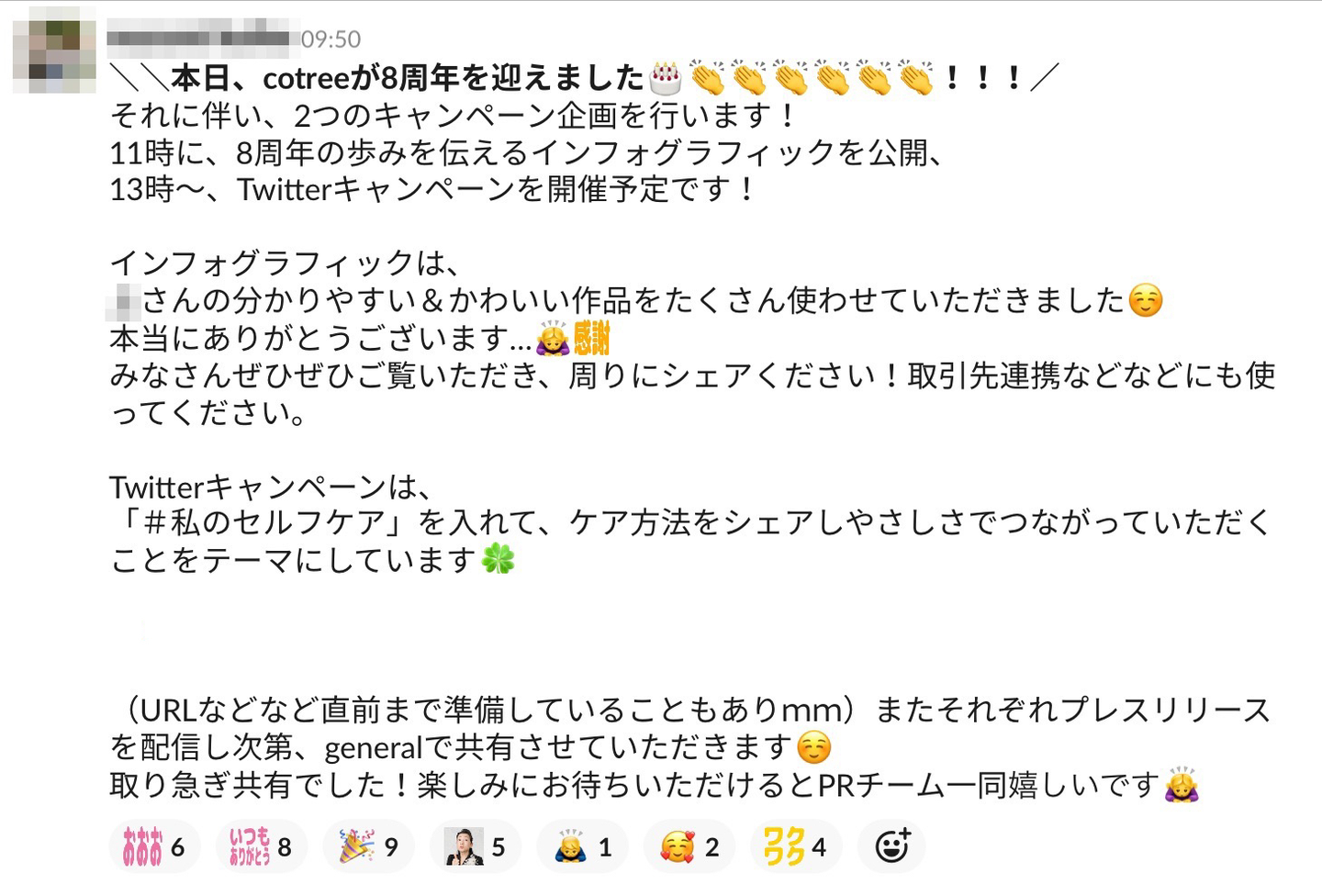先日、おかげさまでcotreeが8周年を迎え、slackでもお祝いムードに包まれました!