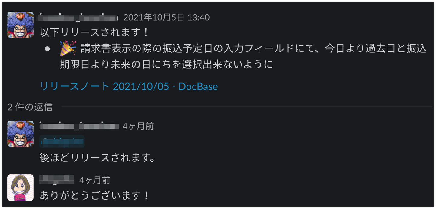 たとえば以下はリリースをアナウンスする Slack チャンネルの画像です。こんな風に社内の人に変更が入った事を伝えます。またこのチャンネル以外にも週次 MTG でリリースされた機能についてのちょっとした説明があり、そこで機能の挙動に対する疑問点があればビジネスサイドの方達も質問等をする事があります。