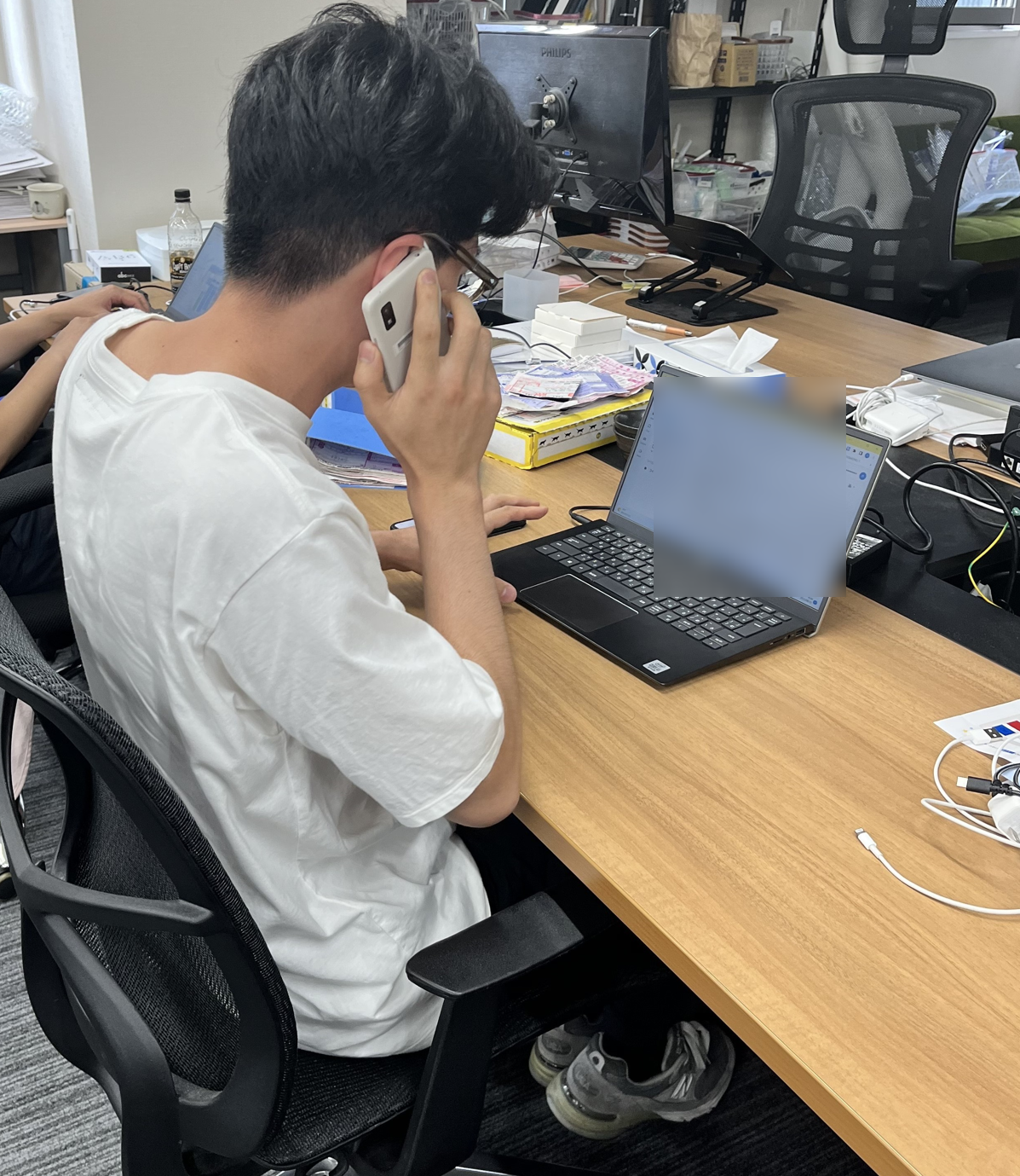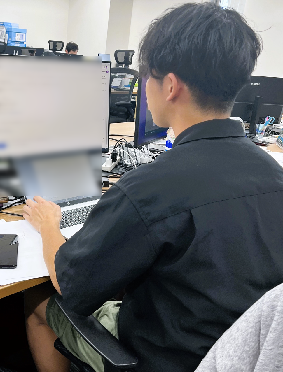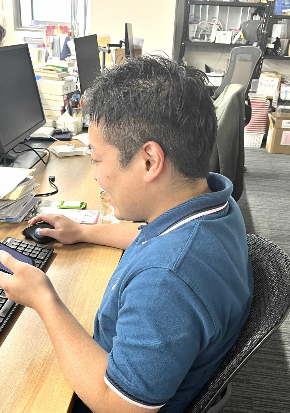 (顧客対応で忙しそうな茶位くんを後ろから激写)