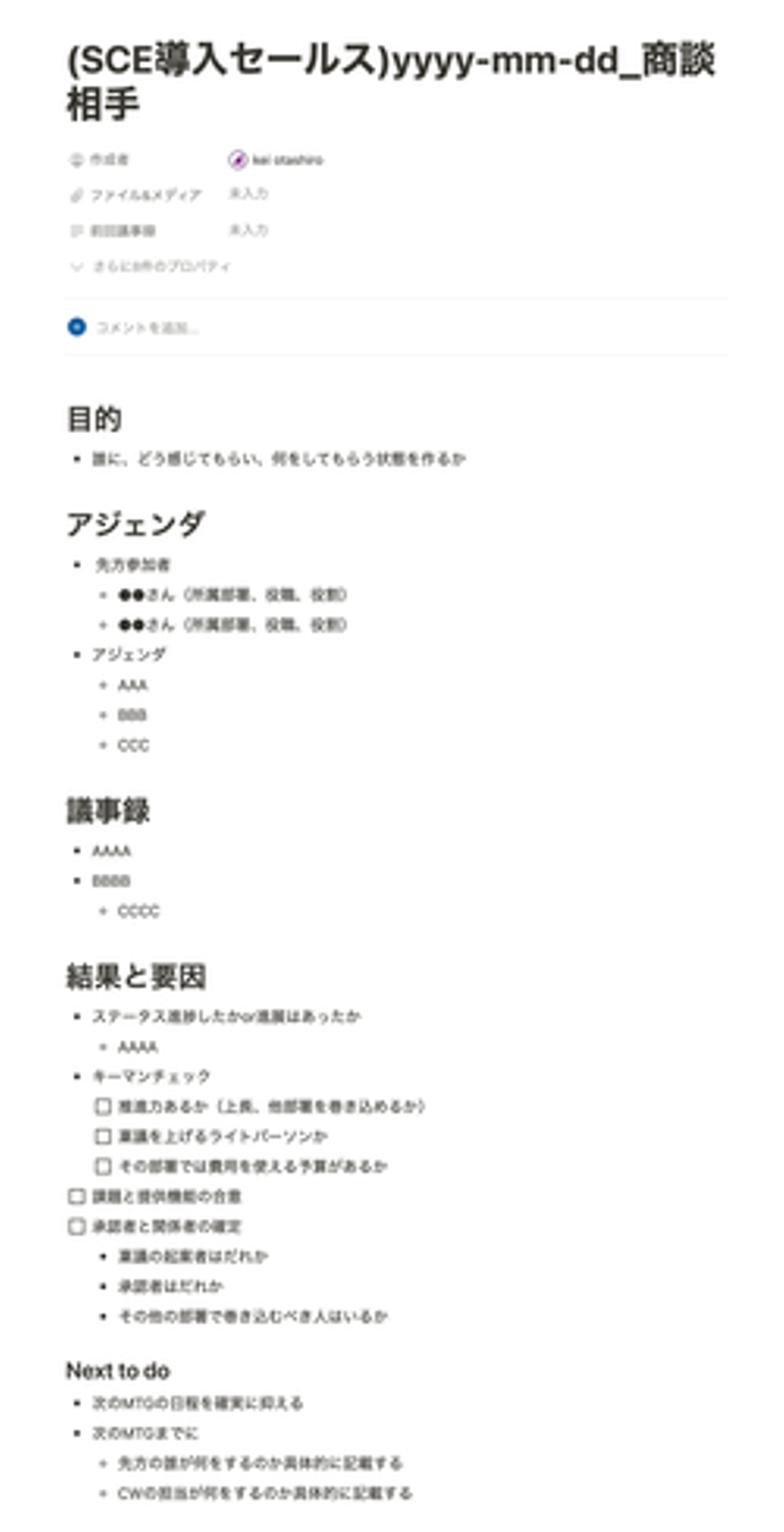 実は先ほど言ったアジェンダのフォーマットというのは薮本さんの作ったものなんです。まず商談の目的、結果と要因もすごく細かく設定します。今日商談した人に社内でプロジェクトを推進いただけそうか? 「SHOPCOUNTER Enterprise」を稟議に上げるライトパーソンは誰なのか? プロジェクト予算は確保できるのか? 提供価値に合意できているのか? 承認者は誰なのか? スケジュールはどうなのか?……あらゆるところで仮説を十分に積み上げた上で商談に臨むよう鍛えられました。