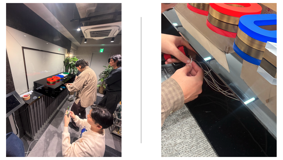 様々な人の協力を得て、部品の組み込みや配線口のカットが完了。ついに最終仕上げの時がきました!「LEDライトは無事つくのか?」「埋め込んだ台座は不安定ではないか?」と、誰もがヒヤヒヤしながら見守ります。