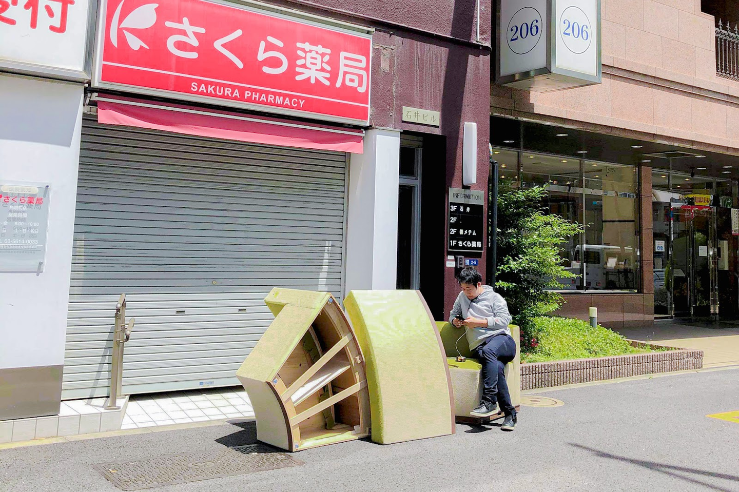 (写真:ソファが届いたものの搬入できず、仕方なしにとりあえず屋外でくつろぐメンバー)
