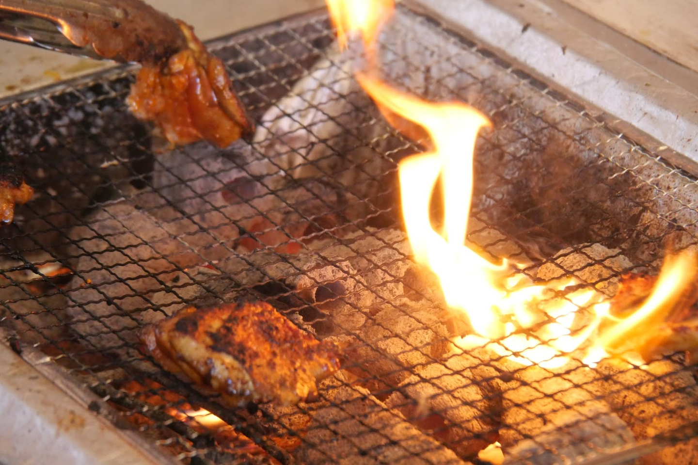 お肉は炭火でこんがりと。いかつい大将が焼きそばを作ってくれる、特別なテーブルは見逃せません。
