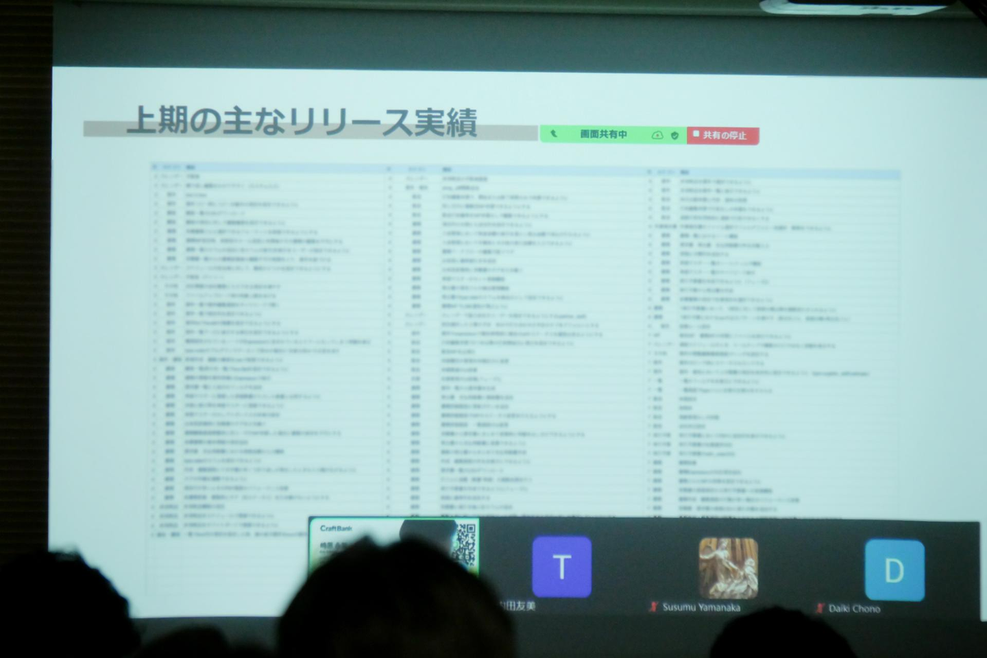 「上期の主なリリース実績」のスライドに表示されたのは、もう後ろの席はおろか前の席でも全然読めないくらいの膨大なリリース。会場は「いつもありがとう!」の拍手と同時に、「キャッチアップが間に合わないよw」というドヨメキに包まれました。