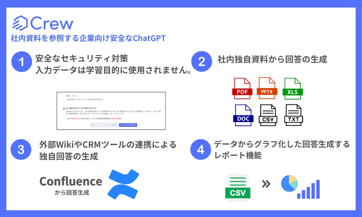 Crewは、個人情報の検知と非表示、権限設定、ログ監視機能を備え、企業での安全なChatGPT使用環境を提供します。