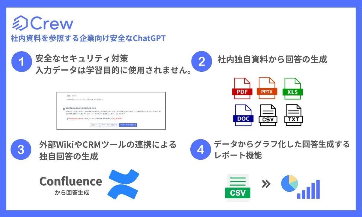 「Crew」は、ChatGPTをビジネスで安全に利用するプラットフォームです。センシティブ情報の検出、従業員の権限管理、そして社内文書に基づく会話支援を提供し、業務効率の向上をサポートします。