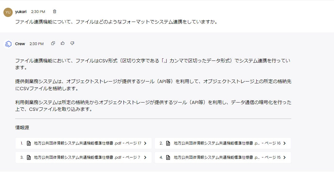 ・Crew に「ファイル連携機能についてファイルはどのようなフォーマットでシステム連携をしていますか。」という質問を入力、回答生成