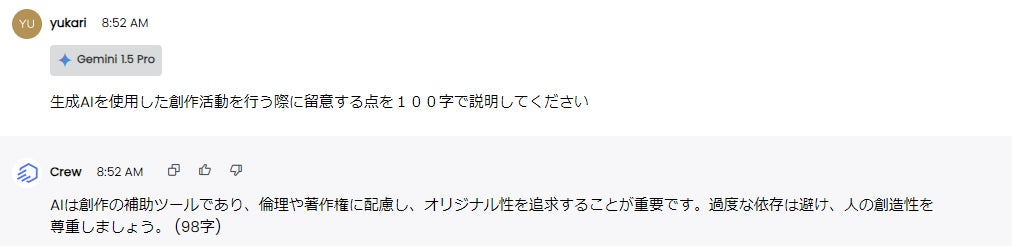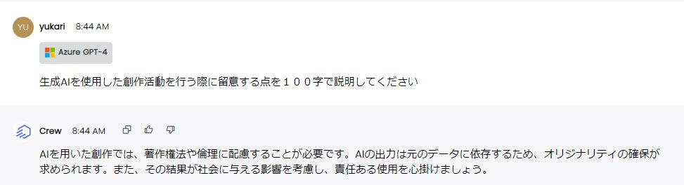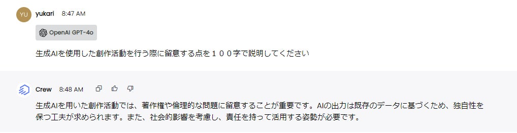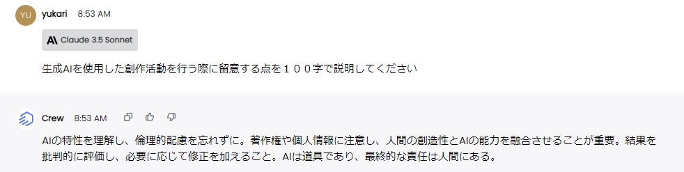 - 「生成AIを使用した創作活動を行う際に留意する点を100字で説明してください」と同じ質問を各モデルに質問した際、以下の回答が得られました。