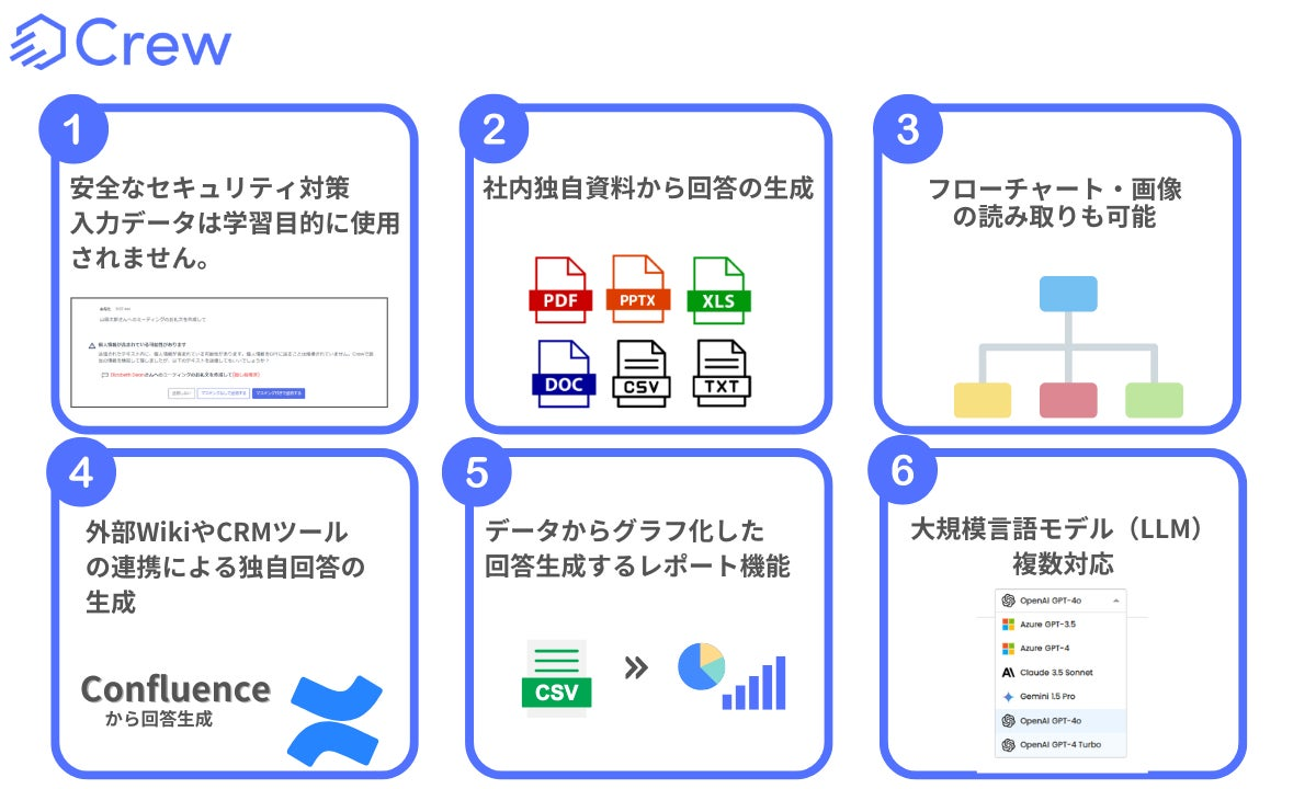 「Crew(クルー)」は、「社内資料参照の法人向け生成AI」です。Crewは、Azure AI、GPT-4.0、4o、4o mini、Gemini、Claudeといった複数LLMに対応しています。RAG機能を活用することで、企業の自社データと連携し、蓄積された社内のノウハウを基に精度の高い回答を生成します。