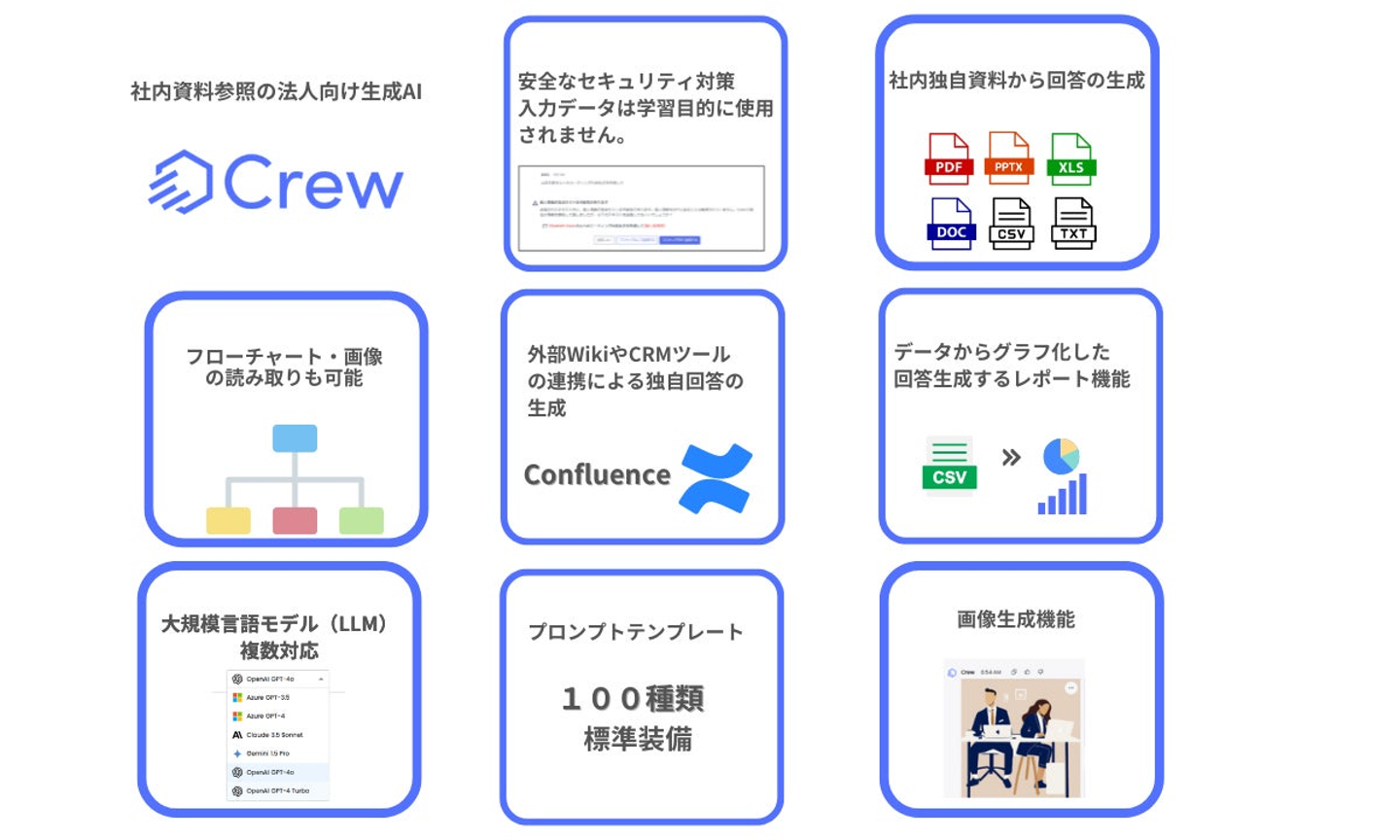 「Crew(クルー)」は、「社内資料参照の法人向け生成AI」です。Crewは、Azure AI、GPT-4.0、4o、4o mini、Gemini、Claudeといった複数LLMに対応しています。RAG機能を活用することで、企業の自社データと連携し、蓄積された社内のノウハウを基に精度の高い回答を生成します。また、自治体様向けに特化したプロンプトテンプレートを標準装備しております。