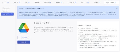 Google Driveは、Google社が提供する組織内外の相手との共同作業をすばやくできるクラウドストレージです。セキュリティを維持したまま利用できることから、ビジネスでも幅広い企業に活用されています。CrewとGoogle Driveが連携することでGoogle Drive内に企業が蓄積してきた資料やドキュメント情報をCrewが参照し、チームが関連業務の質問をした際により適切な回答を生成できるようになります。
