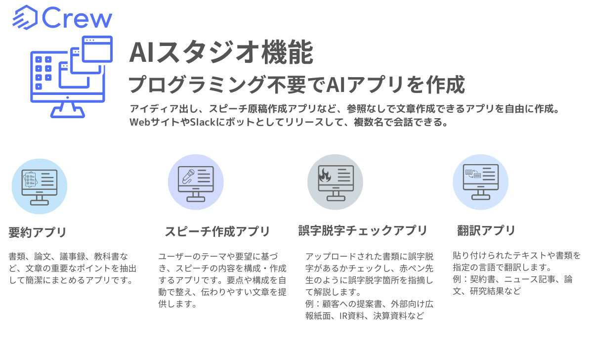株式会社クラフター(本社:東京都港区、代表取締役社長:小島舞子、以下「クラフター」)は、社内資料参照の法人向け生成AI「Crew(クルー)」を提供しています。この度、新たにAIアプリをプログラミング不要で作成できる「AI スタジオ」機能のサービス提供を開始いたしました。