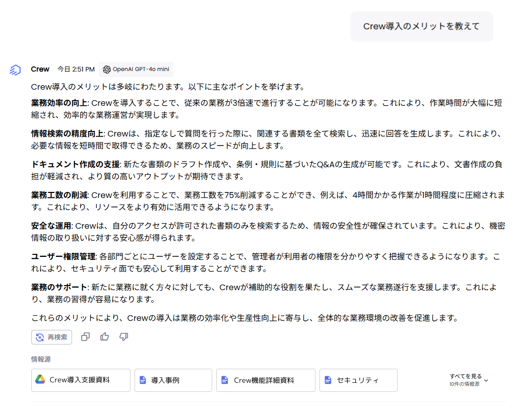 また、一元検索機能では、ユーザーの権限設定も書類と連動しています。そのため、もし権限がない書類についてユーザーが質問をした場合は、Crewは回答を出しません。ユーザーは、自分が持つ権限の範囲外の情報にアクセスすることはできません。