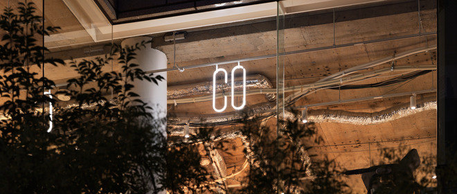 ゆったりとしたソファと緑に囲まれたガラス張りのオープンラウンジを備えた事務所が体現しているように、オープンでカジュアルな仕事場です。